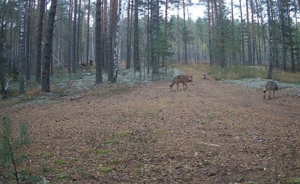 На записях с фотоловушки старшего государственного инспектора в области охраны окружающей среды Николая Субботина стая волков изучает территорию. По словам работников заповедника, эти звери ‒ социальные животные, и живут по строгим правилам иерархии. У каждого серого своя роль.