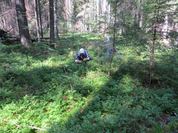 Учет урожайности черники проводится на двух трансектах площадью по 1 сотке. Каждая трансекта имеет площадь 25 х 4 метра и разделена на 10 учетных площадок размером 2,5 х 4 м. Из-за большого количества ягоду учет проводился в этом году 8 и 9 июля. В первый день трудились два сотрудника, а во второй день – три. Всего было затрачено 11 часов.