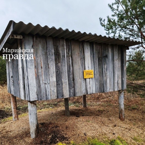 Кормушка в двух уровнях, внизу высыпаны зерноотходы, на верхнем этаже лежит запас пшеницы. Завезли, пока есть дорога, а то, если не хватит, приходится доставлять корма зимой, уже на снегоходах, что, конечно, сложнее, поясняет Сергей Онучин.