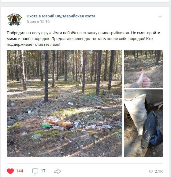 Его челлендж поддержало «охотничье братство». В комментариях люди писали, что часто сталкиваются с таким беспорядком, поэтому с собой всегда берут мусорные пакеты для уборки.
