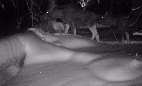 Как предположили специалисты, лосихи, видимо, шли по своему обычному маршруту, когда их внимание привлек свет инфракрасного детектора фотоловушки.