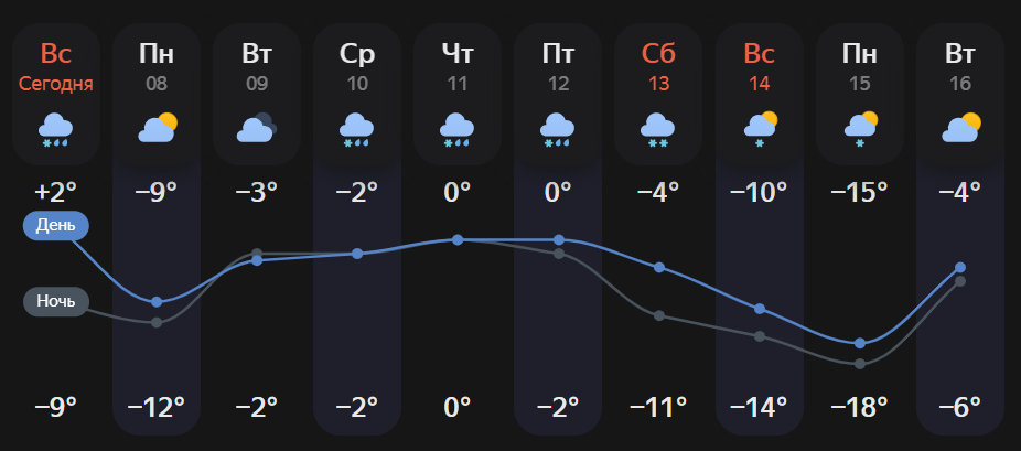 9 декабря, согласно данным сервиса Яндекс.Погода, в регион вернется тепло. Но этот период будет недолгим, к концу следующей недели синоптики прогнозируют похолодание до –14 градусов, а 15 декабря ожидается до 18 градусов мороза.