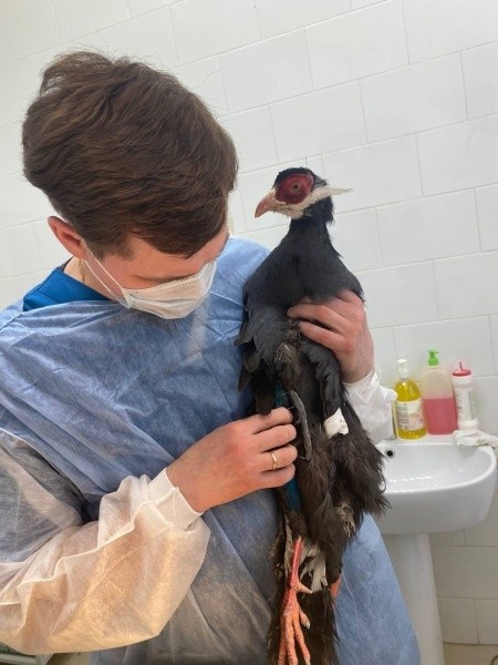 На Йошкар-Олинскую городскую станцию по борьбе с болезнями животных привезли фазана, который повредил лапку, когда его пытались поймать. Рентген показал, что у пернатого пациента - оскольчатый перелом голени. Ветеринарный хирург Юрий Волков провел операцию методом остеосинтеза на внешнем фиксаторе.