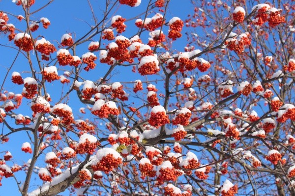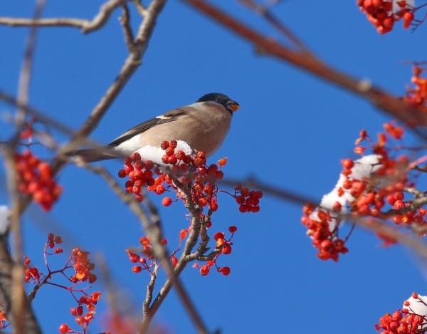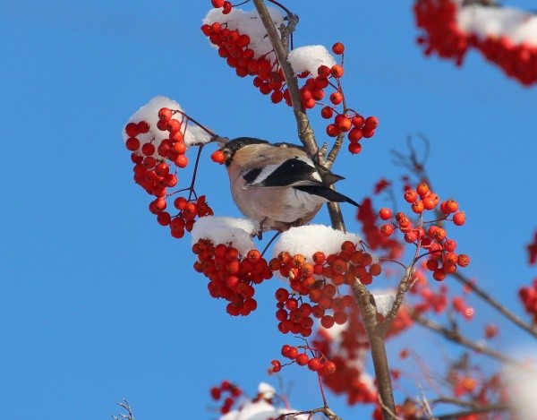 Птицы облюбовали рябину, которая является для них одним из любимых лакомств. Едят они её не целиком: своим крепким клювом достают только семена, а мякоть выбрасывают. Узнать снегиря можно по ярко-красной грудке и чёрной «шапочке». У самок и молодых птиц окрас обычно более тусклый. Особенно внушительно птица выглядит в зимнее время, когда нахохлится и расправит перья.
