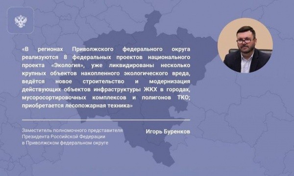 Игорь Буренков сообщил, что в регионах Приволжского федерального округа реализуются 8 из 9-ти федеральных проектов национального проекта «Экология» за исключением проекта по сохранению озера Байкал. По нацпроекту в округе ликвидированы несколько крупных объектов накопленного экологического вреда. К примеру, в Нижегородской области – шламонакопитель «Белое море» и полигон ТБО «Игумново». Также ведётся новое строительство и модернизация действующих объектов инфраструктуры ЖКХ в городах, мусоросортировочных комплексов и полигонов ТКО; приобретается лесопожарная техника и многое другое.