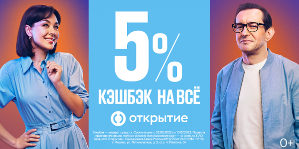 В банке «Открытие» стартовала акция «Кешбэк 5% с Opencard». Новые клиенты, оформившие карту Opencard до 10 июля 2022 года, получат 5% кешбэка на все покупки.