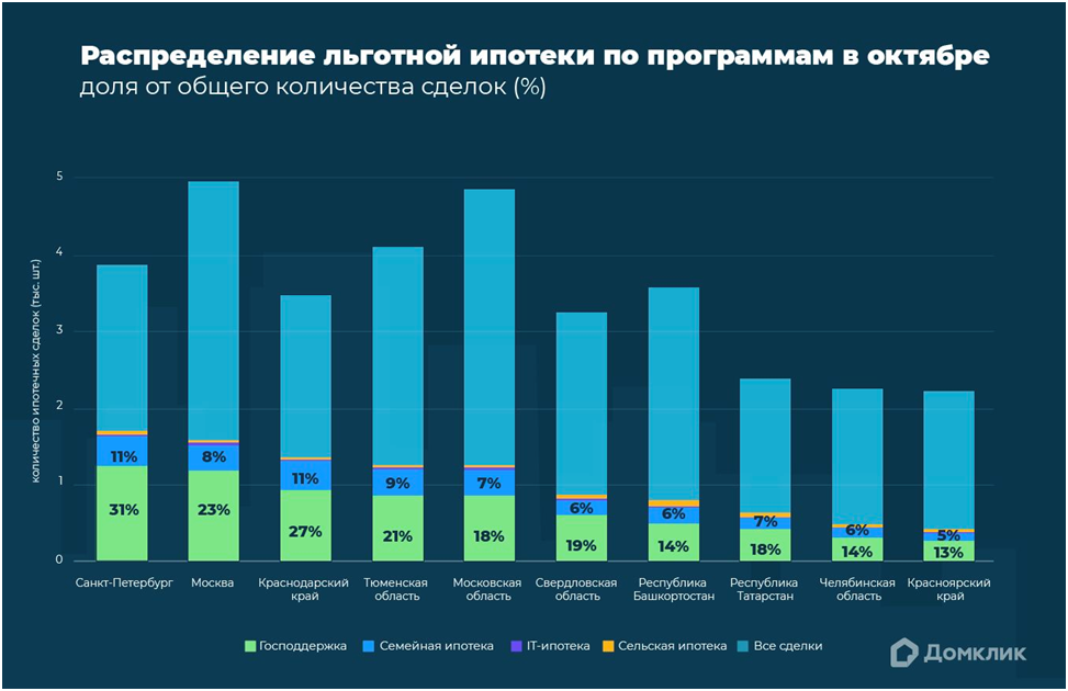 В октябре на фоне общего снижения интереса к новостройкам доля сделок по льготной ипотеке в целом по стране снизилась на 3,3 процентных пункта по сравнению с сентябрем — до 24,6%. Сильнее всего из крупных регионов России доля снизилась в Москве (-8,1 процентных пункта), Московской области (-7,2 процентных пункта) и Краснодарском крае (-5,6 процентных пункта).