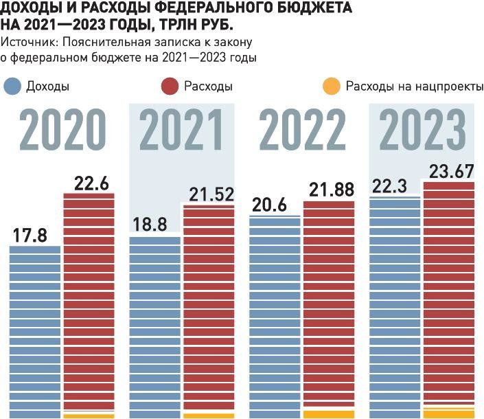 По данным «Российской газеты», бюджет останется дефицитным еще три года (в 2021 году – на 2,75 трлн рублей (2,4% ВВП), в 2022 году − на 1,25 трлн рублей (1% ВВП), в 2023 году − 1,41 трлн рублей (1,1% ВВП). На нацпроекты за этот период выделят 2,25 трлн, 2,62 трлн и 2,79 трлн рублей соответственно.