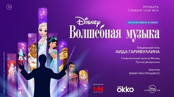 Трансляция концерта «Волшебная музыка Disney» состоится на платформе мультимедийного сервиса Okko 7 января в 18:00 по ссылке. Зрители увидят яркие эпизоды популярных фильмов и услышат популярные песни в исполнении знаменитых артистов. В фильме прозвучат композиции из анимационных хитов «Холодное сердце», «Русалочка», «Золушка», «Король Лев», «Красавица и чудовище», «Моана», «Рапунцель: Запутанная история» и др. Любимую всеми музыку исполнит Симфонический оркестр Москвы «Русская филармония» под управлением Фабио Мастранджело.