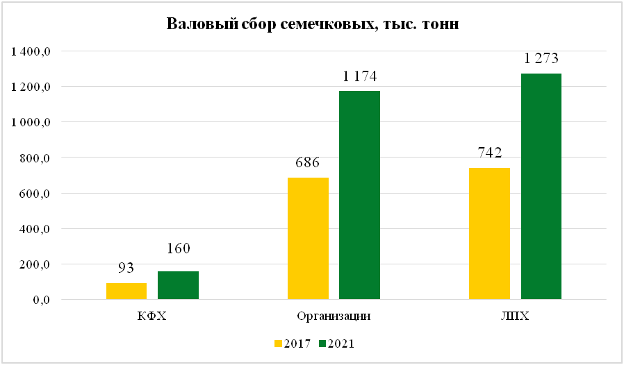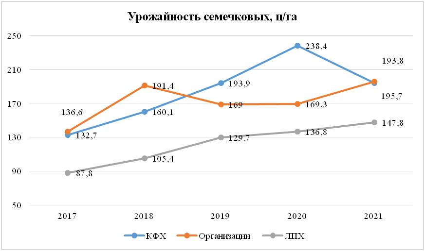 Несмотря на то, что КФХ более чем в 7 раз уступают предприятиям и хозяйствам населения по производимой продукции, именно фермеры показали наиболее стабильный рост урожайности в расчёте на гектар площади. В 2020 году они добились результата в 238,4 ц/га (у организаций было 169,3 ц/га). По итогам 2021 года КФХ и организации вышли примерно на один уровень урожайности – немногим менее 200 ц/га.