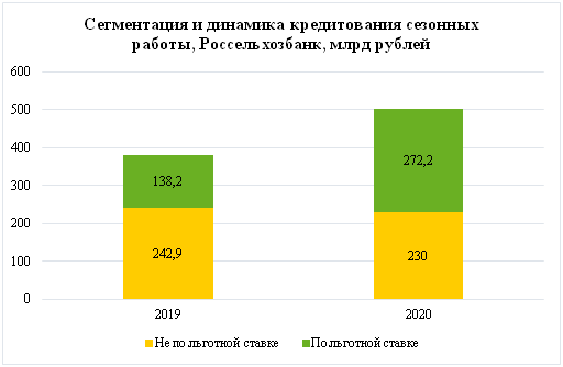 В 2020 году банк предоставил заемщикам АПК 7 126 кредитов на сезонные работы, что почти на 10% превышает показатель предыдущего периода. Более половины средств предоставлены по льготной ставке. Их доля в структуре выдач увеличилась с 36% в 2019 году до 54% в 2020 году.
