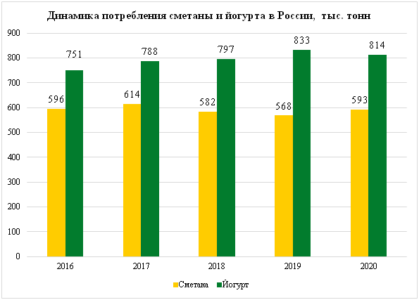 С 2016 по 2019 гг. среднедушевое потребление сметаны снижалось с 4,1 кг до 3,9 кг на человека в год. В то же время среднедушевое потребление йогурта показывало обратный тренд, увеличившись с 5,1 кг до 5,7 кг в год. Разрыв между потреблением сметаны и йогурта увеличивался.