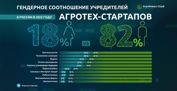 Аналитики Центра развития финансовых технологий Россельхозбанка провели анализ половой принадлежности основателей стартапов, осуществляющих деятельность по линии агротехнологий в Российской Федерации. Большинство стартапов было запущено мужчинами (82% проектов), а число женщин агротех-предпринимателей составляет 18%.
