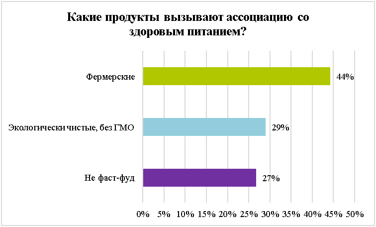 По мнению 44% участников опроса, основой здорового питания являются именно фермерские продукты, которые имеют преимущества над продуктами крупных производителей по качеству и натуральности, ведь, как считает почти половина респондентов, это домашняя еда, а она, по их мнению, самая лучшая. Ещё 29% опрошенных считают, что на рынке продовольственных товаров сложно найти продукты, выращенные без химии, поэтому для них важно покупать экологически чистый продукт и без добавления ГМО. 27% придерживаются позиции, что для рационального подхода к здоровью достаточно отказаться от употребления продуктов, считающихся фаст-фудом.
