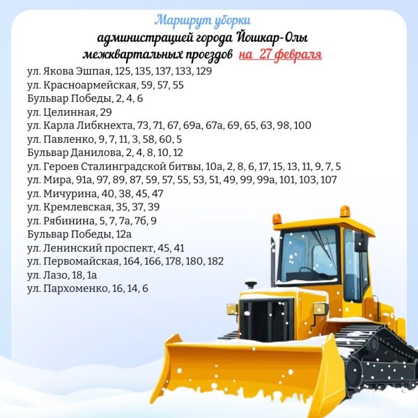 В Йошкар-Оле сформирован планируемый маршрут движения снегоуборочной техники по расчистке межквартальных проездов 27 февраля.