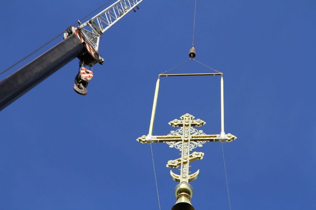 После совершения чина строители с помощью специальной техники подняли купола и закрепили их на барабанах. Вес главного купола – 7 тонн. Он установлен над центральной частью храма. Еще один купол увенчал колокольню. Четыре малых купола строители установили несколькими днями ранее.