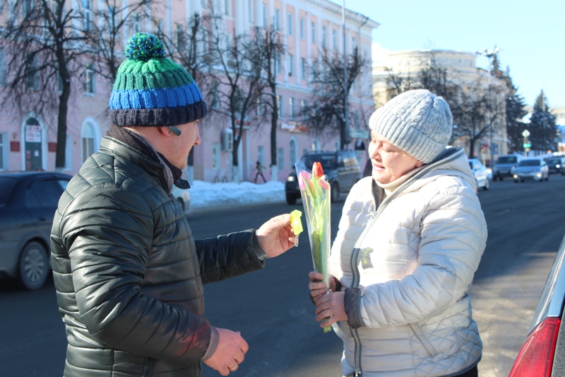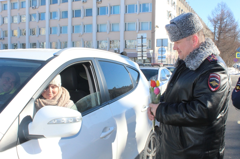 Цветы женщинам сегодня вручали на площади имени В.И. Ленина. Сначала сотрудники ГАИ останавливали машины под управлением автоледи, а уже затем мужчины в погонах и без них поздравляли водителей с первым весенним праздником и желали зеленого света по жизни, завершая свою короткую речь вручением цветов.