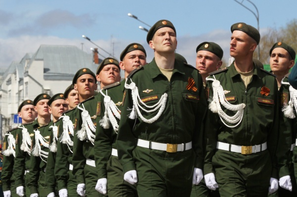 Прохождение торжественным маршем: войска местного гарнизона, кадеты, военная техника |
