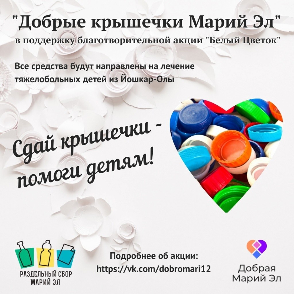 Суть ее проста и заключается в сборе обычных пластиковых крышек, которые впоследствии будут переработаны. Деньги, вырученные за время акции, отправятся прямиком в фонд благотворительной акции «Белый цветок». Школы и детские сады уже откликнулись на призыв: эти вещи занимают мало места, а сдача пластика вызывает внутри детей чувство ответственности и гордости за себя: обычное дело – и несет добро!«В благотворительности нет маленьких дел. Каждый человек в любом возрасте и с любым достатком может стать благотворителем. Даже ребенок!», − так анонсировали проведение акции в регионе добровольцы Марий Эл.