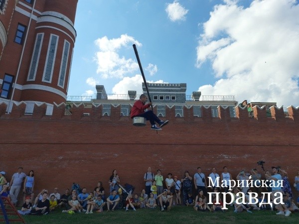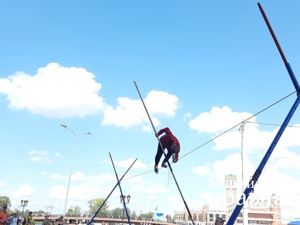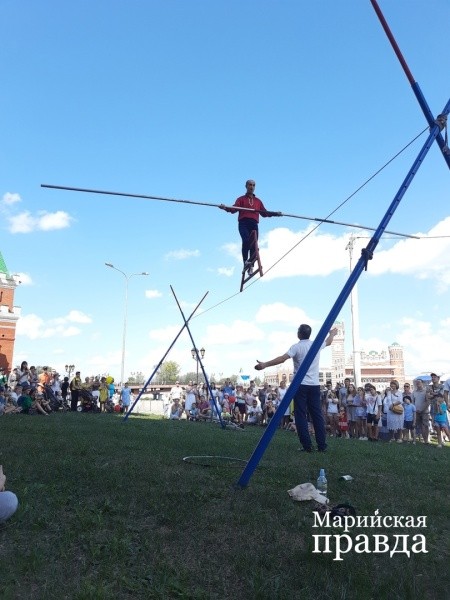 Частью программы, посвященной Дню города 5 августа, стало выступление команды из Дагестана. В программу вошли трюки, исполненные артистами на специальном тросе ‒ со стороны шатком и вызывающим любопытство: неужели на нем можно идти? Оказалось, можно даже танцевать и прыгать ‒ эквилибрист не спеша прошелся по канату с шестом, потом показал чудеса равновесия, надев на ноги тазики, там же смог удержать на весу лестницу и залезть на нее, а также держал голову на бутылке, стоящей на веревке, подняв ноги вверх ‒ и все на высоте!