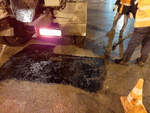 Было уложено еще больше литого асфальта, чем днем ранее. Всего дорожники положили 7,7 тонн литого асфальта, а площадь ямочного ремонта составила 56 кв.м.