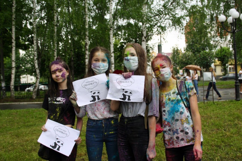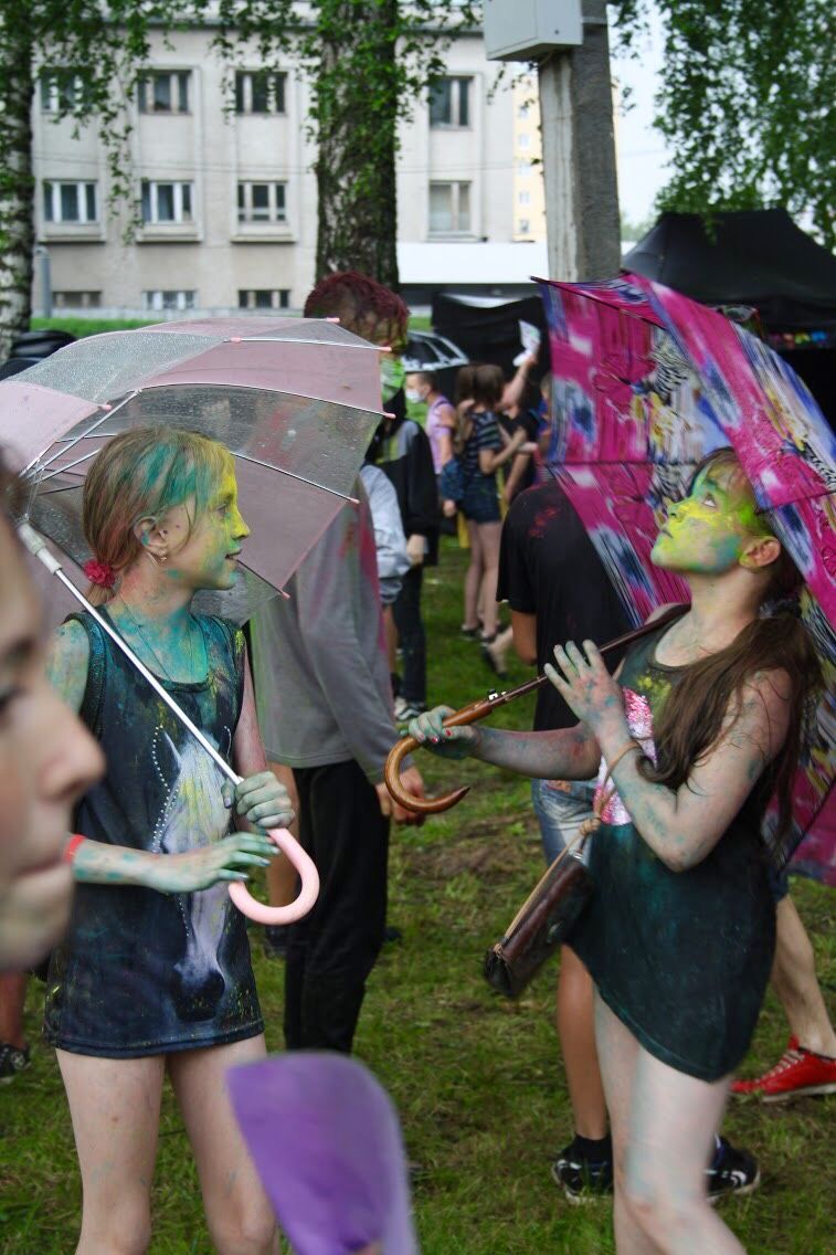 Около ДК им. Ленина в марийской столице между ребятами и дождем шла невероятная борьба. Падающие с неба капли смывали всю краску с лиц молодых людей, становясь стимулом для новых экспериментов и продолжения веселья.