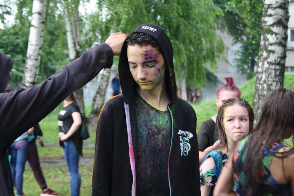 Стоит отметить, что красочный праздник заинтересовал исключительно школьников. Разукрашенные мальчишки привлекали внимание девушек, кидаясь в них красками и убегая, а девчонки ходили с плакатами "Обними меня" или "Бесплатные обнимашки".