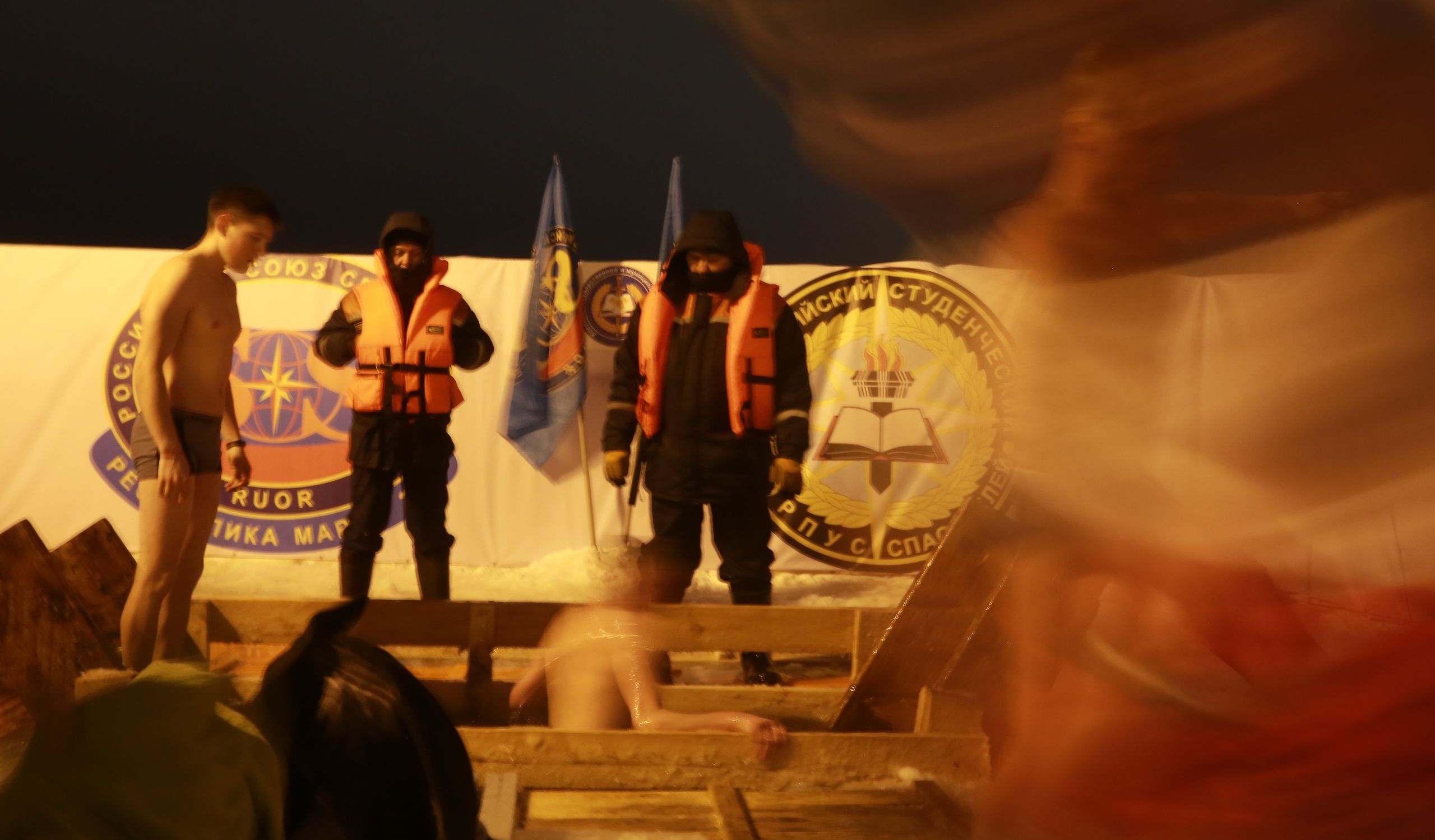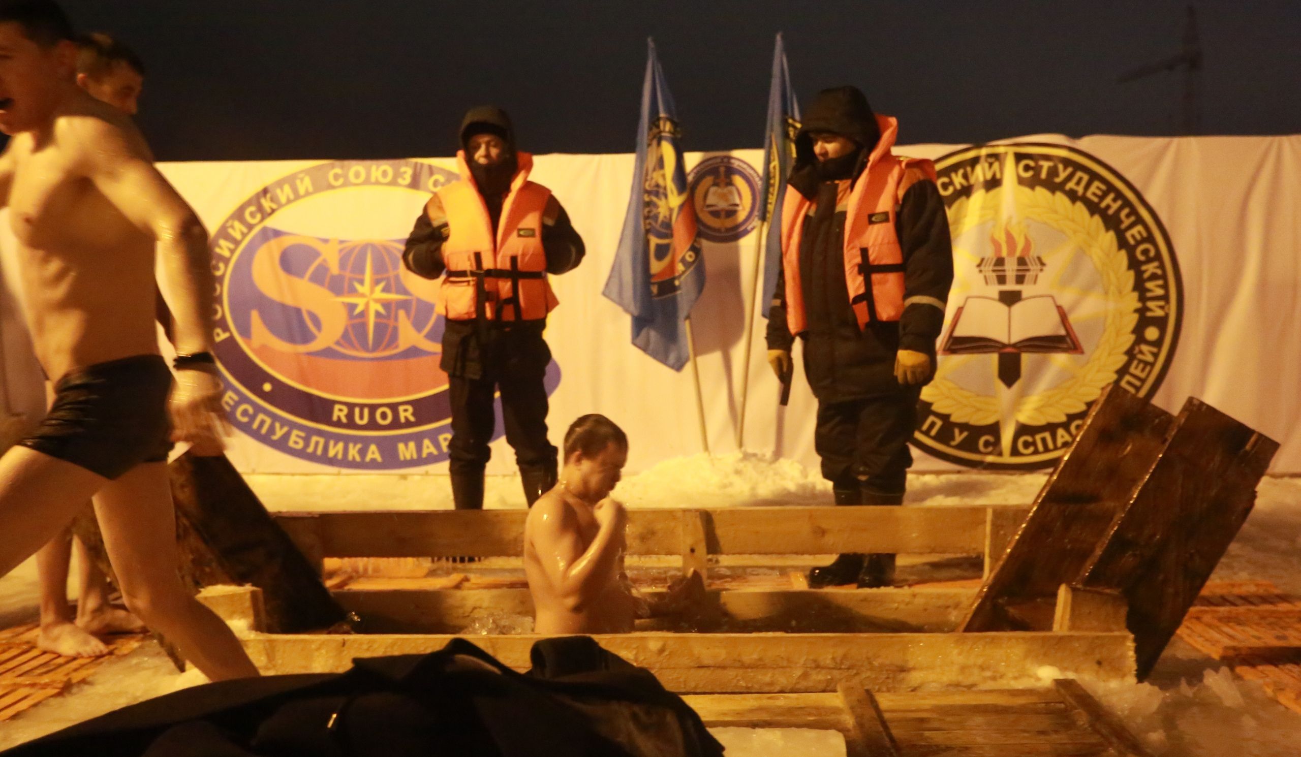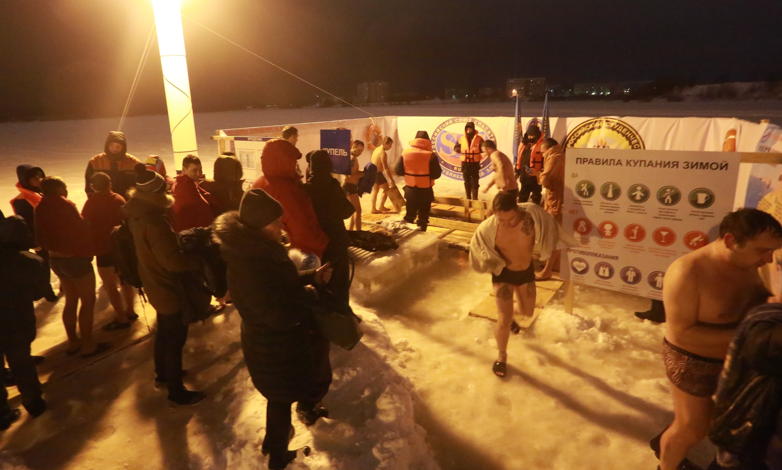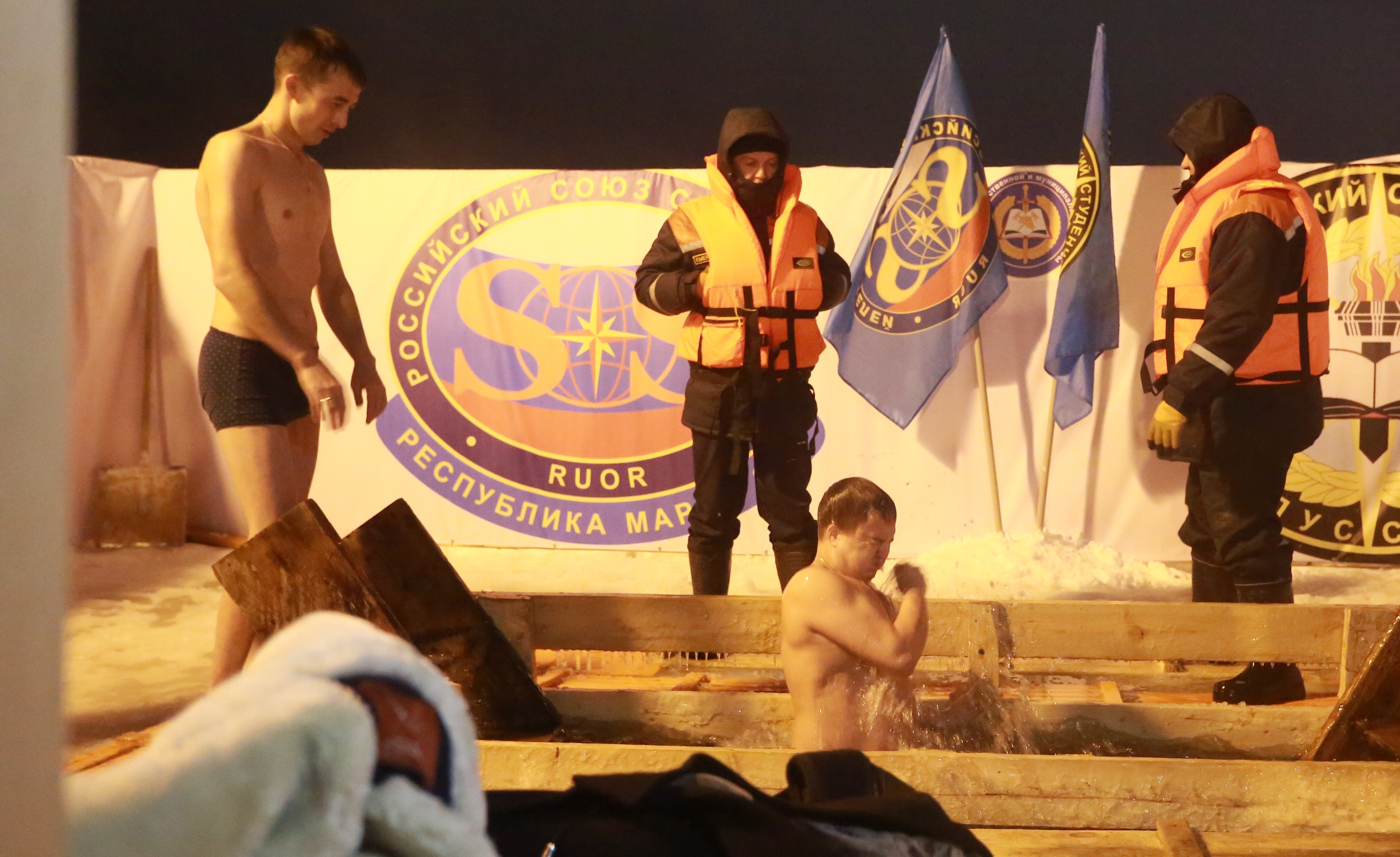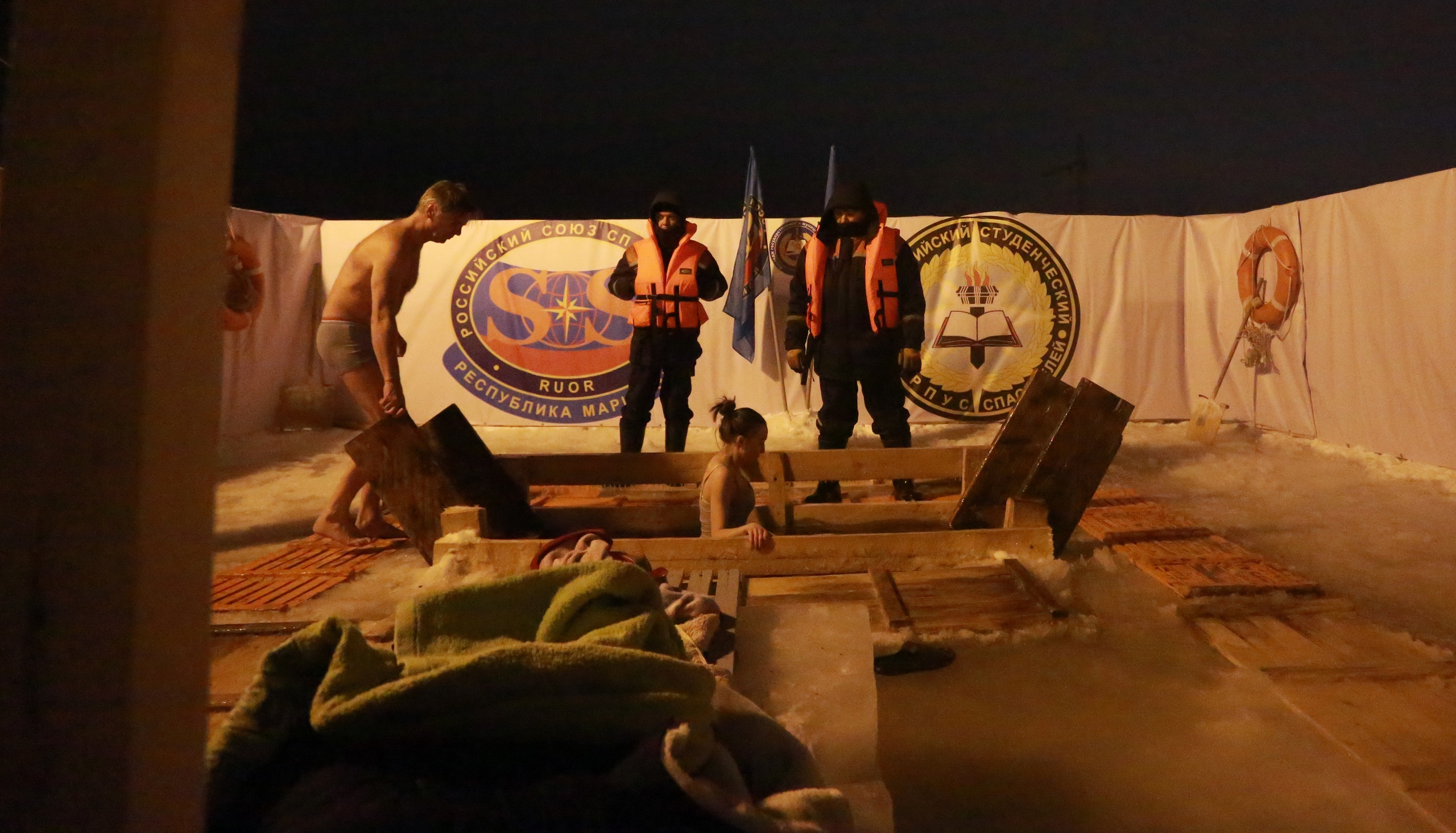 «Официальное» купание в Йошкар-Оле продолжалось до 20 часов. Рядом с желающими окунуться дежурили спасатели и другие специалисты. Для удобства людей ГУ МЧС России по Марий Эл установило палатки, где можно было переодеться и согреться.