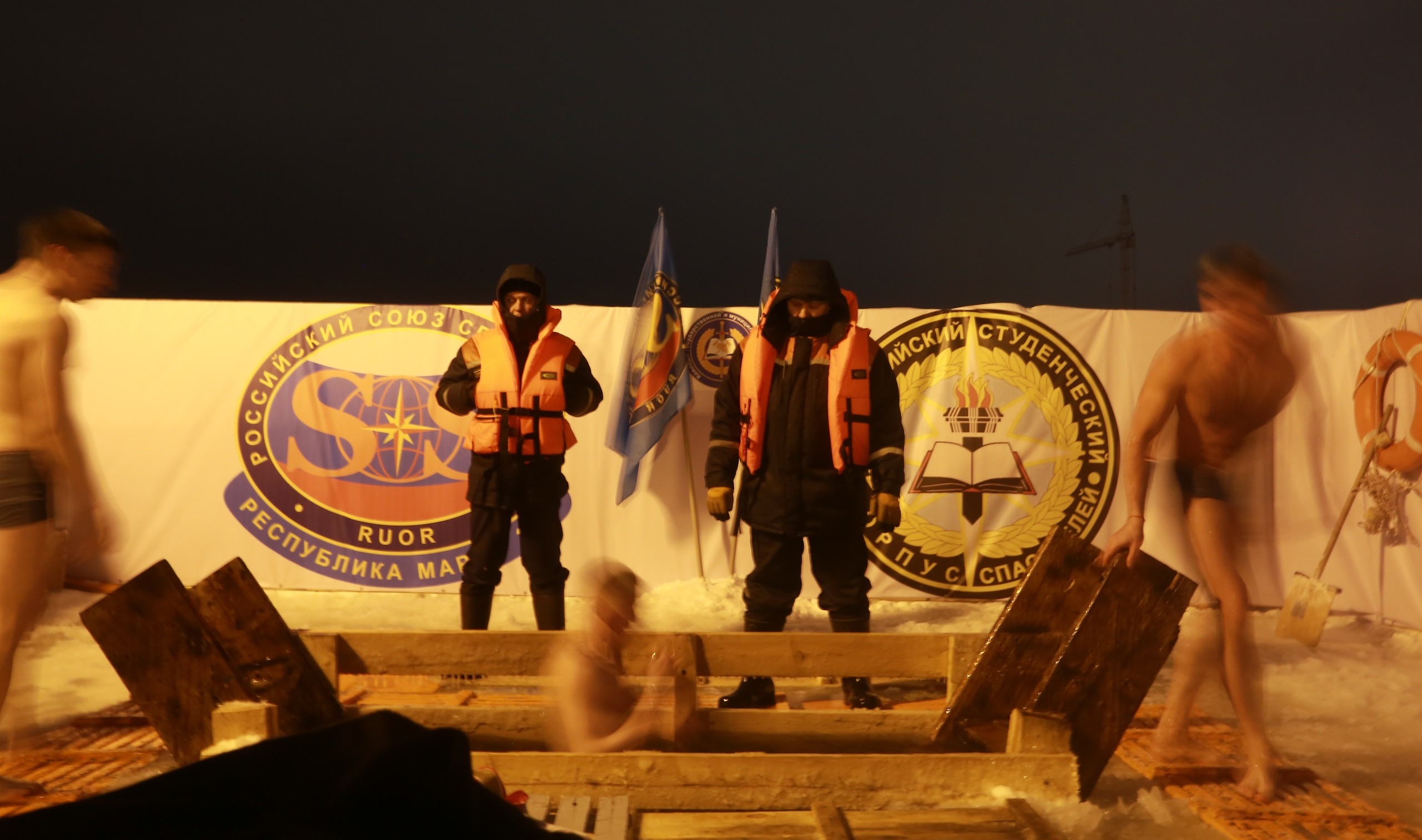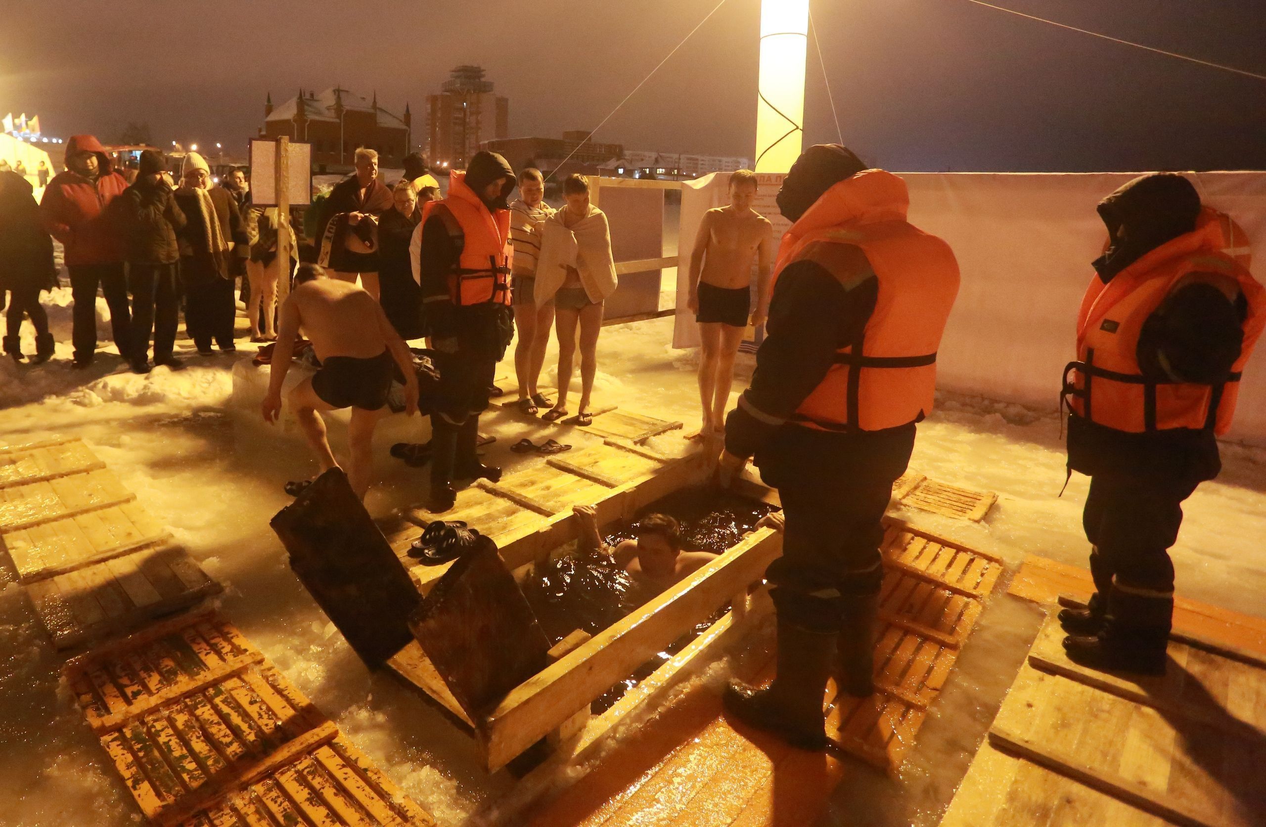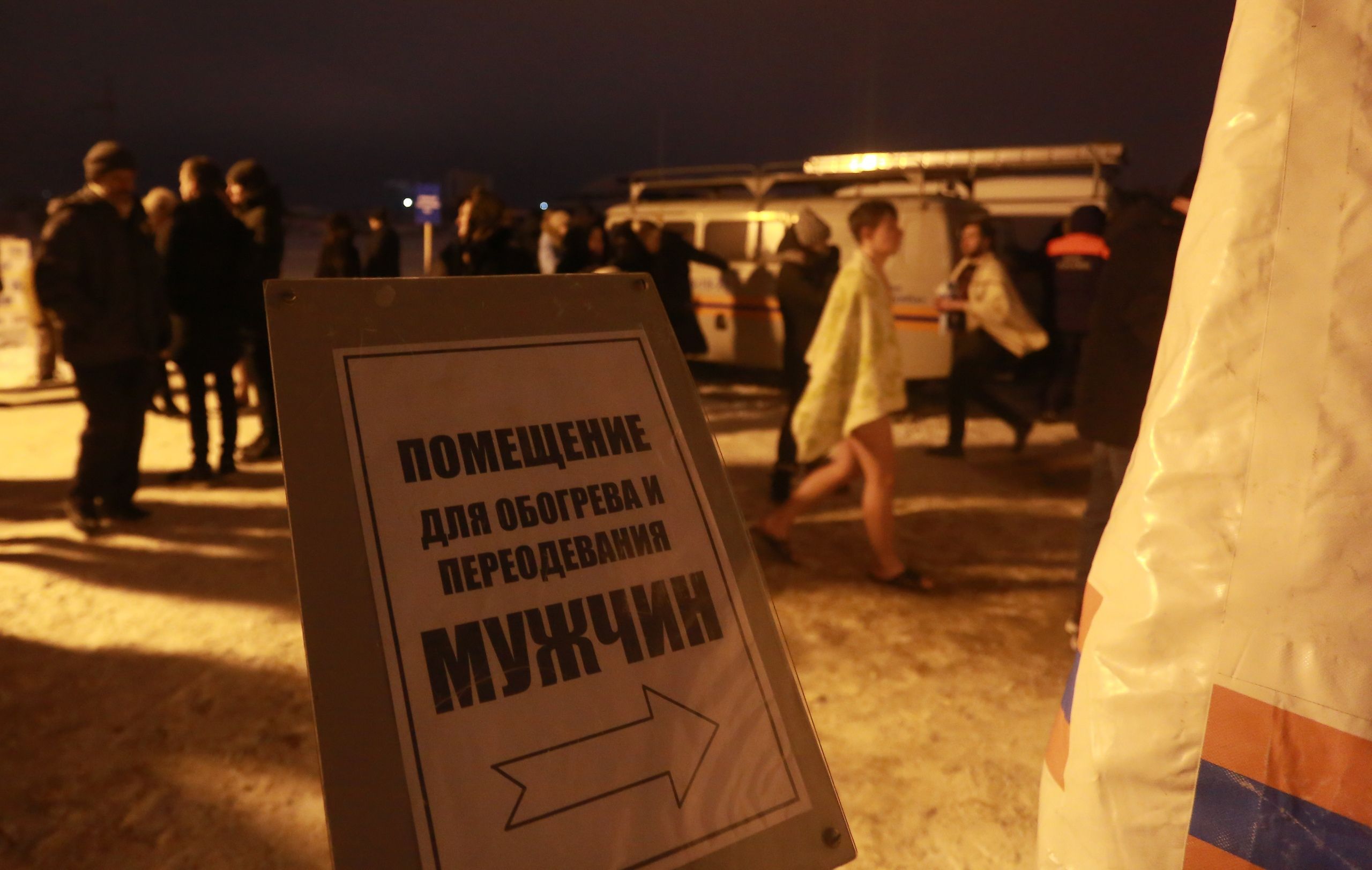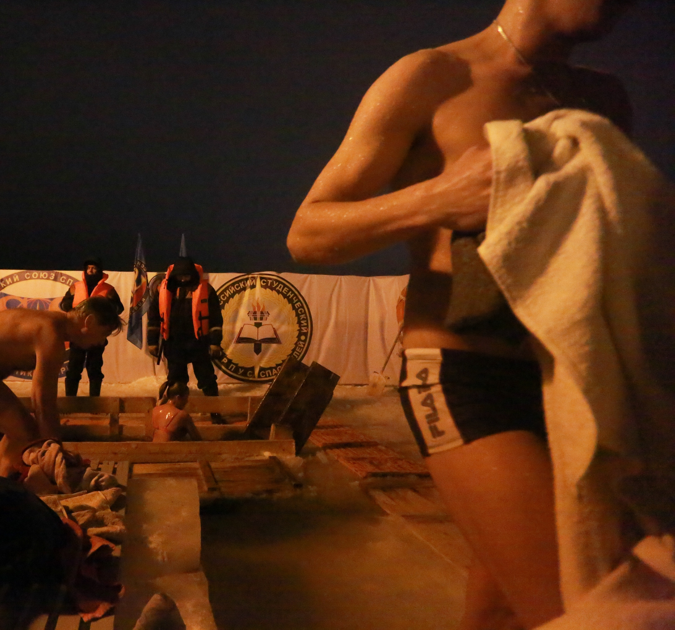 «Официальное» купание в Йошкар-Оле продолжалось до 20 часов. Рядом с желающими окунуться дежурили спасатели и другие специалисты. Для удобства людей ГУ МЧС России по Марий Эл установило палатки, где можно было переодеться и согреться.
