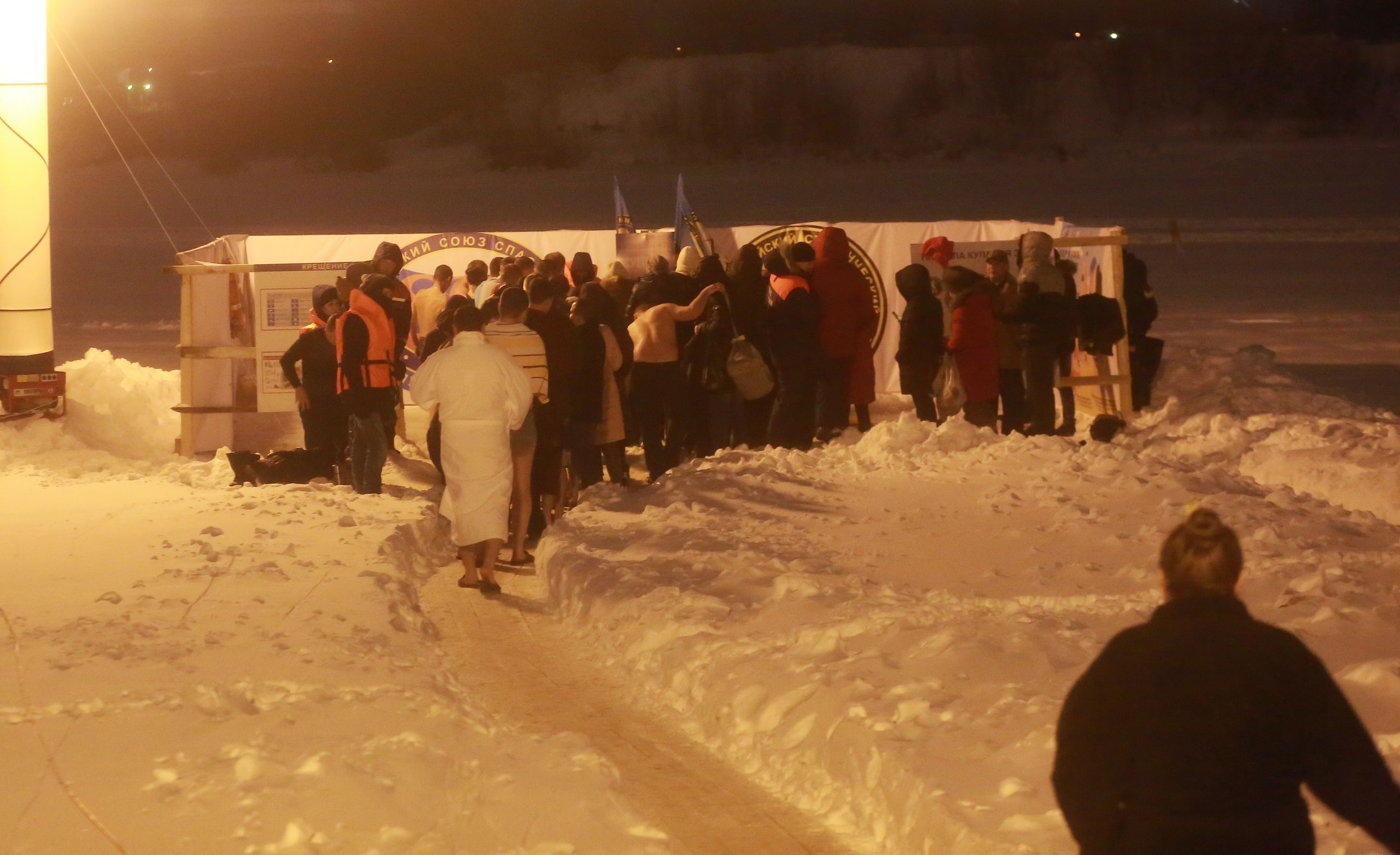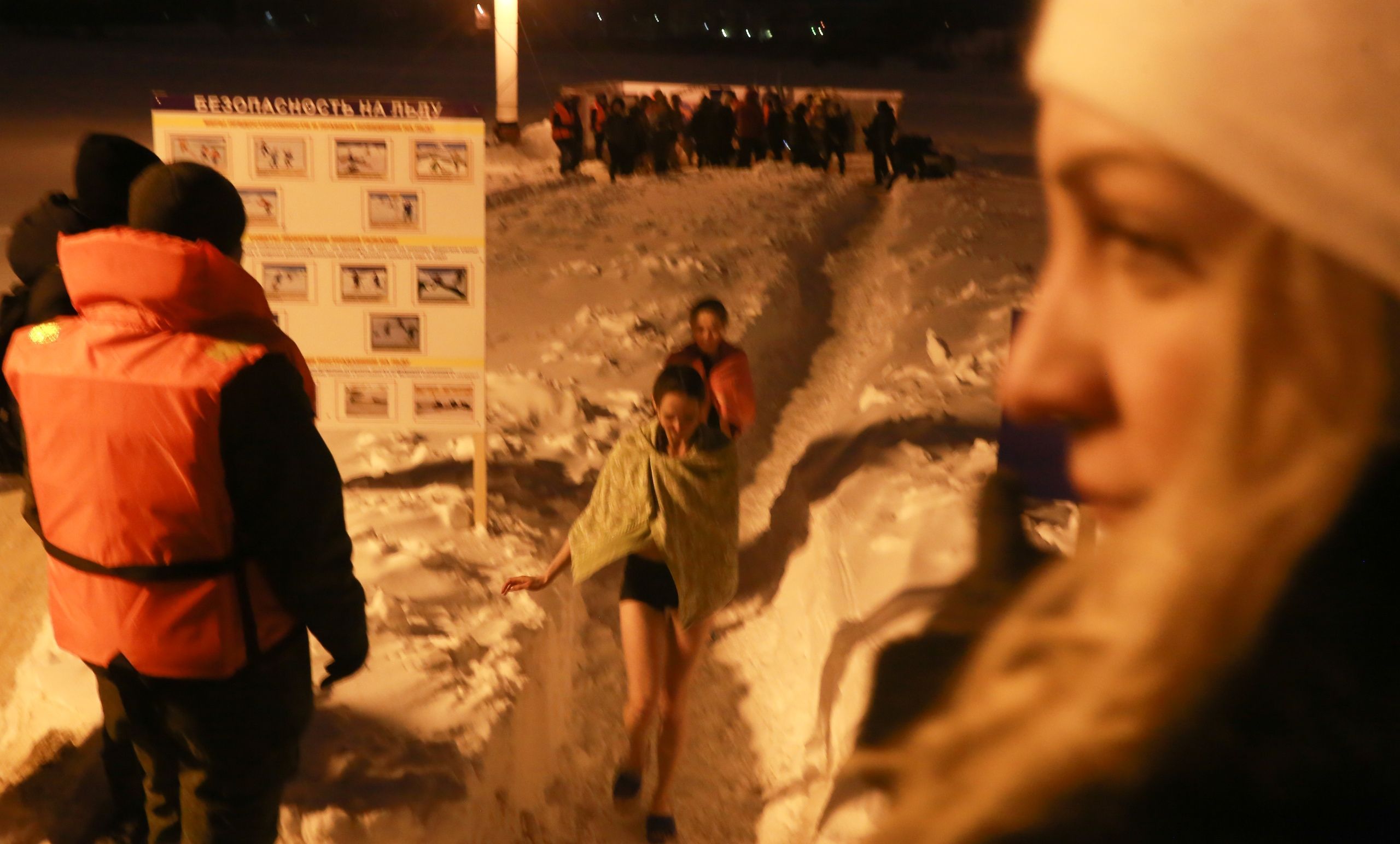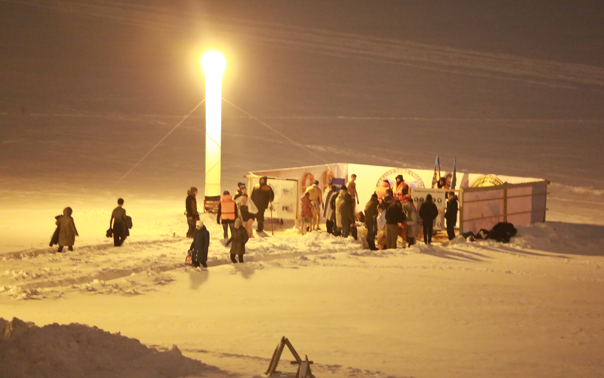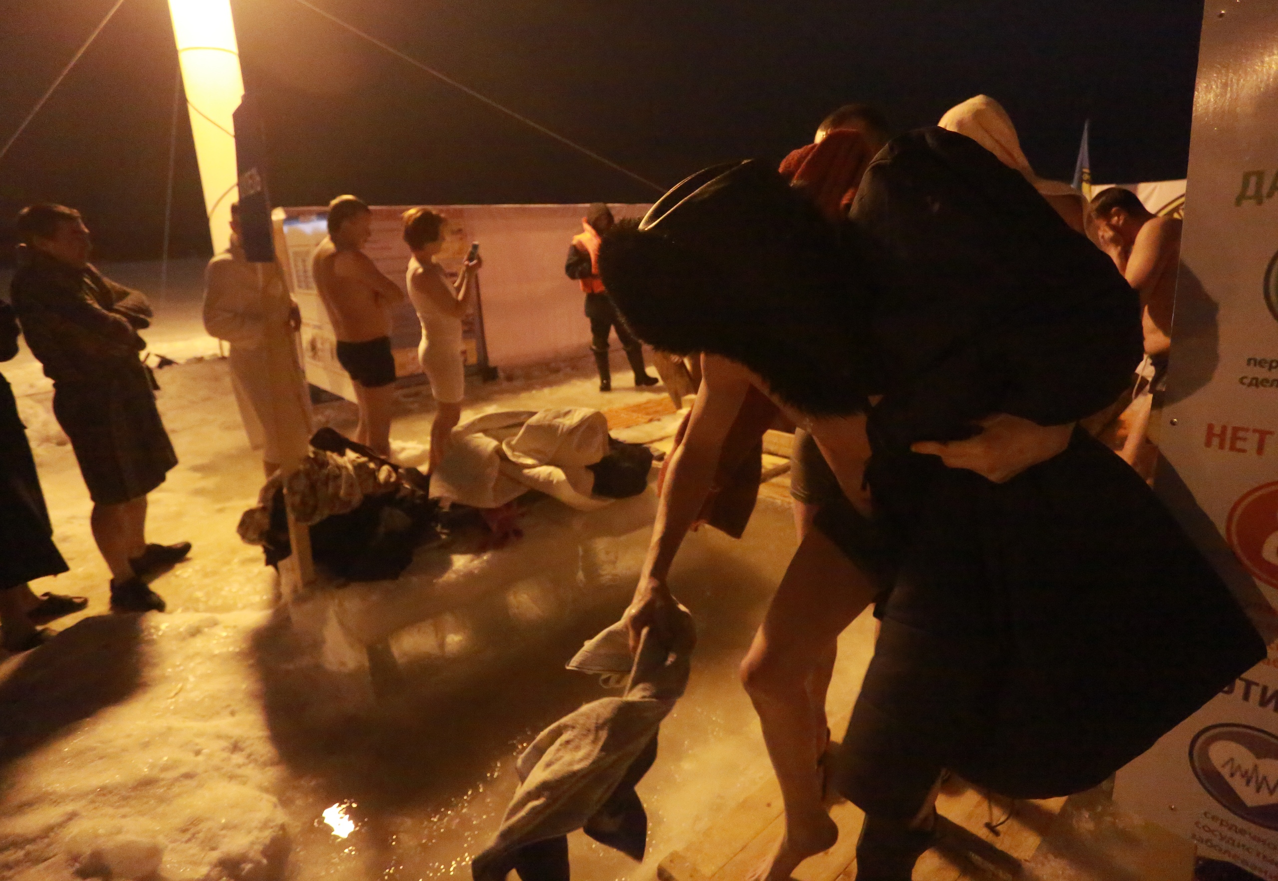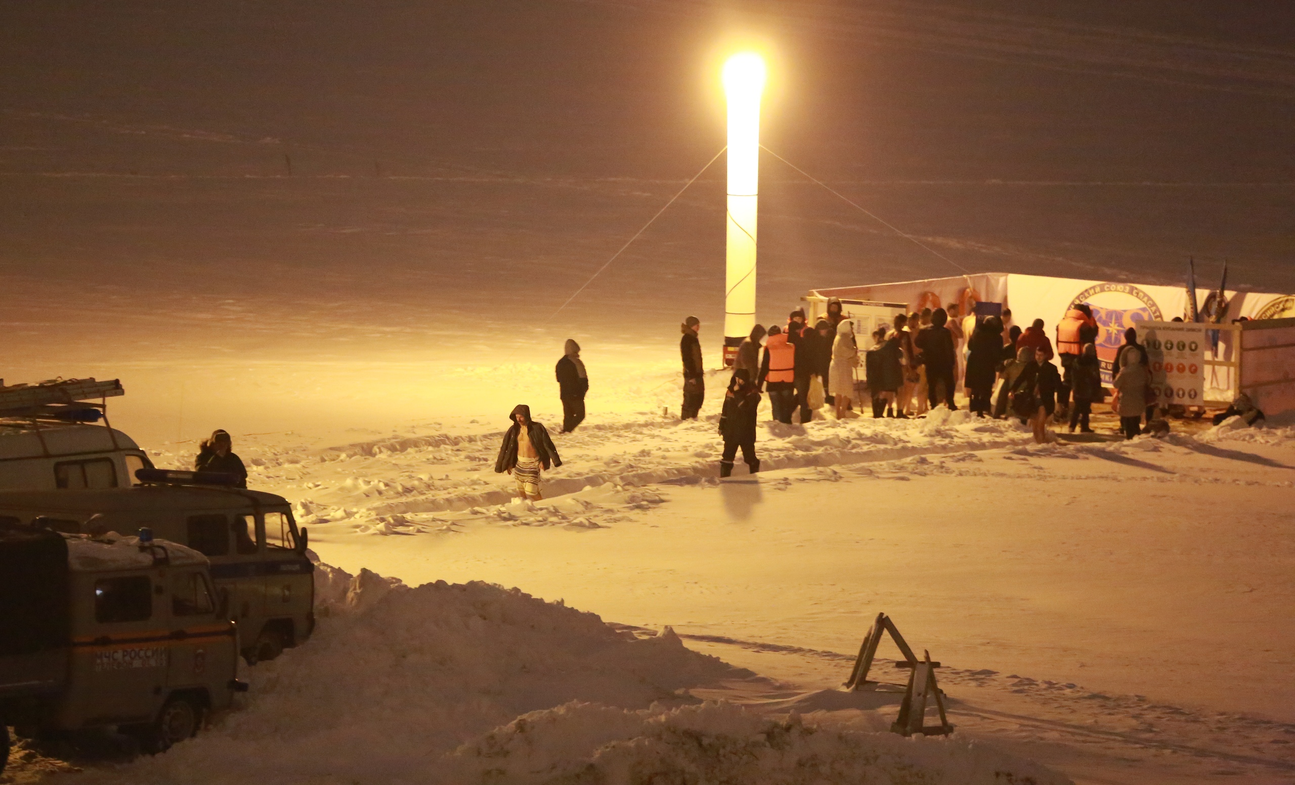 «Официальное» купание в Йошкар-Оле продолжалось до 20 часов. Рядом с желающими окунуться дежурили спасатели и другие специалисты. Для удобства людей ГУ МЧС России по Марий Эл установило палатки, где можно было переодеться и согреться.