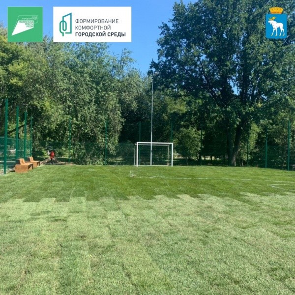 Рабочие занимаются устройством пешеходных дорожек, устанавливают малые архитектурные формы, обустраивают спортивную площадку и поле для игр в мини-футбол, сообщили в администрации города, отметив, что на площадке для мини-футбола уложили газонную траву.