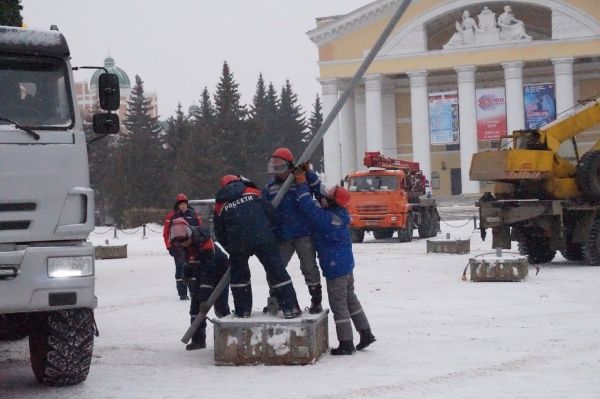 Установка елки на площади Ленина - процесс непростой. Сначала устанавливают бетонные блоки, затем с помощью крана собирают и украшают елку. Но и это еще не все. Один из главных атрибутов праздника - яркая иллюминация. В Новый год елочка должна"гореть".