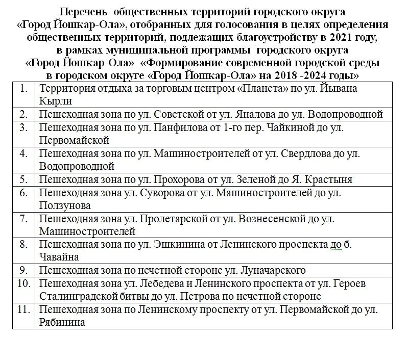 Оставить свой голос за одну или несколько общественных территорий имеют право йошкаролинцы, достигшие 14 лет.