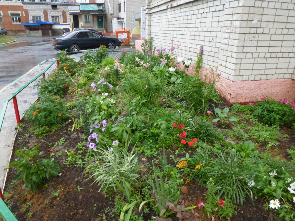 Возле второго подъезда появилась металлическая ограда, а рядом с ней - забетонированный тротуарчик. Потом я застал самосвал, который выгрузил на огороженный участок плодородную землю. Ее быстренько разровняли, и вскоре этот пятачок украсили чудесные цветы: бархатцы, петунии, лилии, флоксы, рудбекии, ирисы, «веселые ребята»...