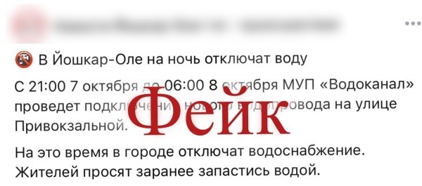 В социальных сетях распространяется недостоверная информация о том, что якобы с 7 по 8 октября в Йошкар-Оле будет отключено водоснабжение.