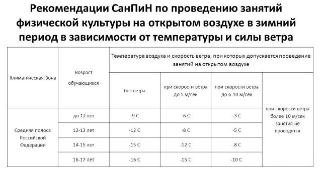 Само собой, уроки физкультуры зимой на улице, регулируются СанПином, где прописаны возраст детей, температура воздуха, сила ветра, условия проведения или отказа от занятий.