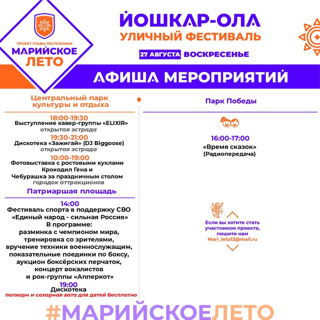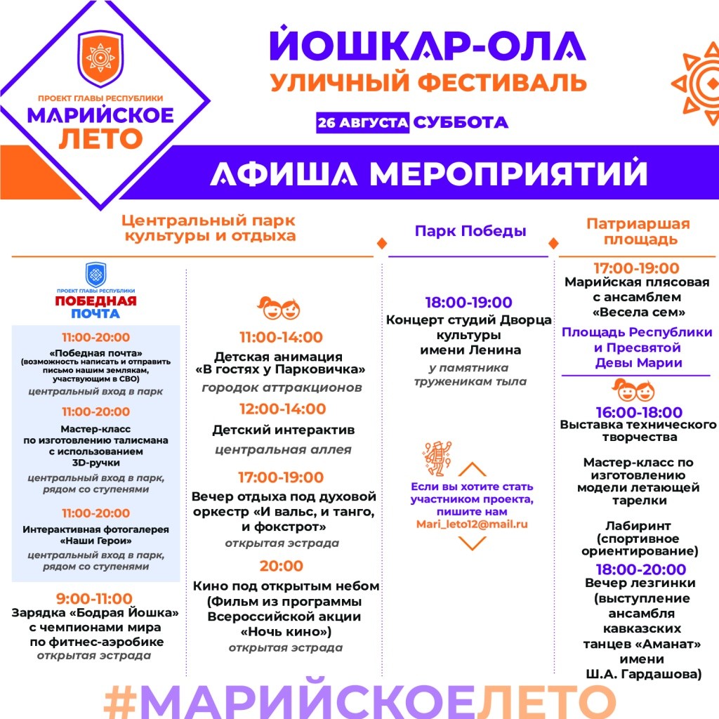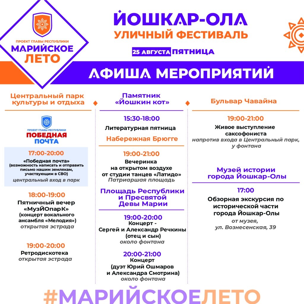 Впереди выходные, а это значит, что пора выбирать, куда пойти и чем заняться. К счастью, благодаря проекту «Марийское лето» сделать это легко: в афише предлагаются и спортивные, и культурные мероприятия для детей и взрослых!