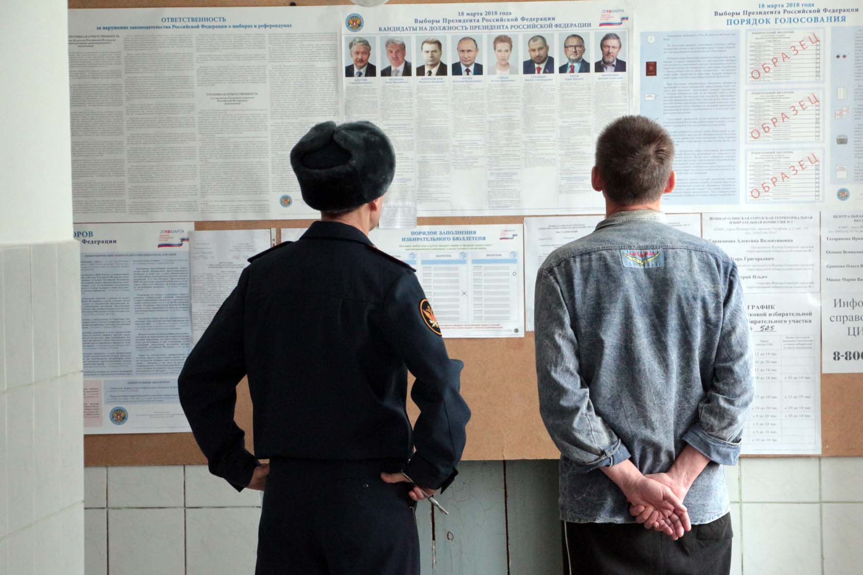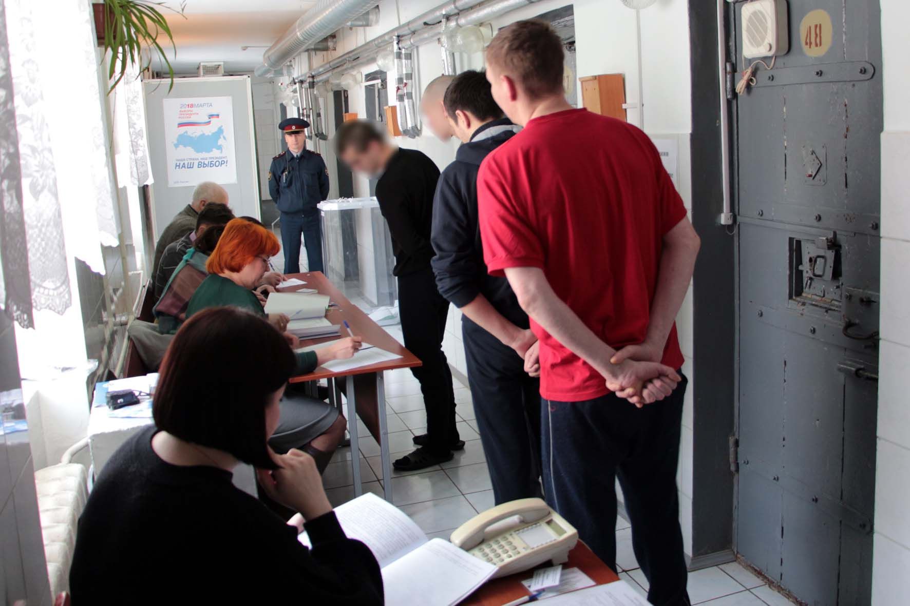 По коридорам СИЗО развешаны плакаты с надписями «Выборы-2018», а перед помещением для голосования вывешен стенд, на котором представлены фотографии кандидатов в президенты и их фото - по пути можно еще раз ознакомиться с информацией о претендентах на высокий пост.