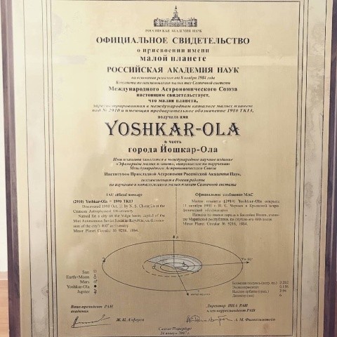В Солнечной системе существует малая планета, или астероид, №2910, которую назвали в честь Йошкар-Олы.