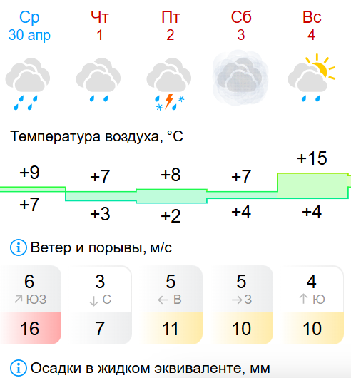 В четверг, 1 мая, будет пасмурно. Настроение омрачит дождь. На следующий день, 2 мая, возможна гроза и снег с дождем, при этом синоптики «обещают» +8 °C днем. 3 мая будет облачно и туманно. В последний выходной день на неделе, 4 мая, солнце почтит своим присутствием, правда, принесет с собой небольшой дождь. Зато будет тепло – прогнозируют аж +15 °C днем (по такой погоде йошкаролинцы наверняка соскучились).