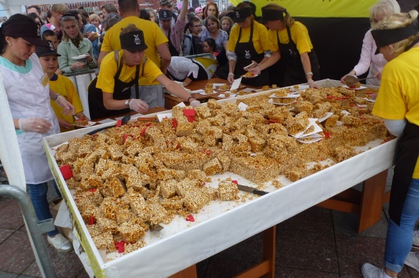Теперь - несколько цифр. Масса великана - 162 килограмма. На его изготовление потратили 53 килограмма муки, 50 - меда, 39 литров подсолнечного масла и 1237 яиц. А пекли чак-чак целых трое суток, но не цельной массой, а по частям, которые потом соединили.