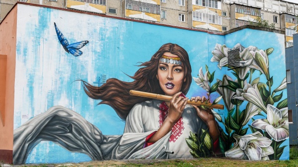 Сереброзубая Пампалче - героиня одноименной марийской сказки. На рисунке Ильи Белова она призывает силы природы, играя на свирели. В группе «Краски города» «ВК» граффити уже получило массу лестных отзывов.