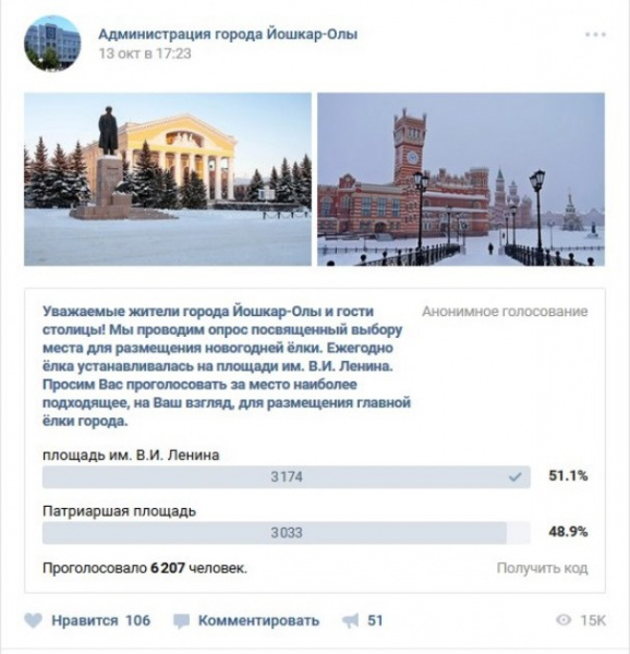 - На официальной странице мэрии в социальной сети «Вконтакте» неделю назад был запущен опрос о том, где лучше установить главную городскую новогоднюю елку. Он показал, насколько неравнодушны жители города к этой теме. Проголосовало 6 тысяч 207 человек, из которых 3 174 человека высказались за установку главной елки на ее привычном месте - на площади Ленина. 3 033 человека проголосовали за перенос елки на Патриаршую площадь. Что любопытно, за площадь Ленина голосовали в большинстве своем женщины, а мужчины выбирали Патриаршую площадь, - сообщает пресс-служба мэрии города Йошкар-Олы.