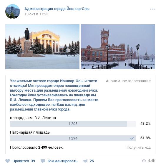 Главную новогоднюю елку в Йошкар-Оле установят на усмотрение мэрии. Голосование, которое проходит сейчас «ВКонтакте», это просто соцопрос, результаты которого не будут решающими в выборе места проведения основных новогодних торжеств. Об этом "Марийской правде" рассказали в администрации столицы Марий Эл.