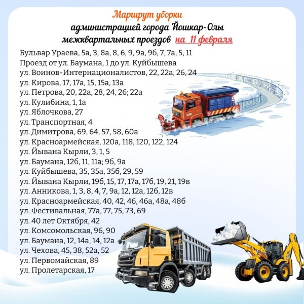 Снег будет расчищаться в Сомбатхее, 6-ом и 5-ом микрорайонах, Березово, Фпестивальном и других районах города. В мэрии Йошкар-Олы просят автовладельцев убирать транспорт, чтобы он не мешал работе техники.