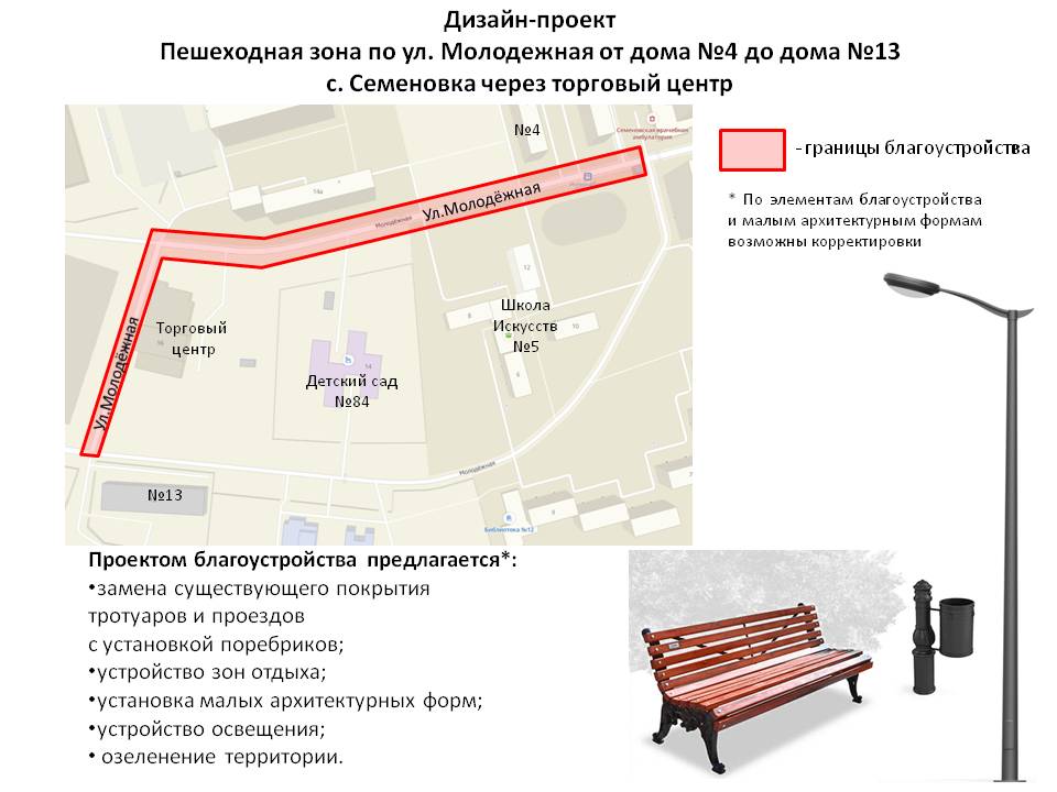 Одним из победителей общенародного голосования программы «Формирование комфортной городской среды» стал проект по благоустройству пешеходной зоны на улице Молодежная от дома №4 до дома №13 села Семеновка через торговый центр.
