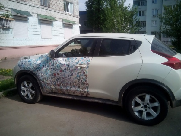 - Вот такой необычный автомобиль я углядел в Йошкар-Оле. Казалось бы, сейчас никого ничем не удивишь, ан нет. Забавно ж. Не краска, не ленты какие. А наклейки. И много так... Очень интересно смотрится, - делится с читателями блогер.