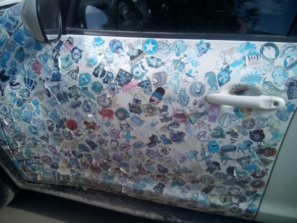 Издалека кажется, что на борт машины просто нанесено краской оригинальное оформление. А вот при ближайшем рассмотрении оказывается, что это… стикеры. Просто обычные, или не совсем обычные, стикеры (наклейки).