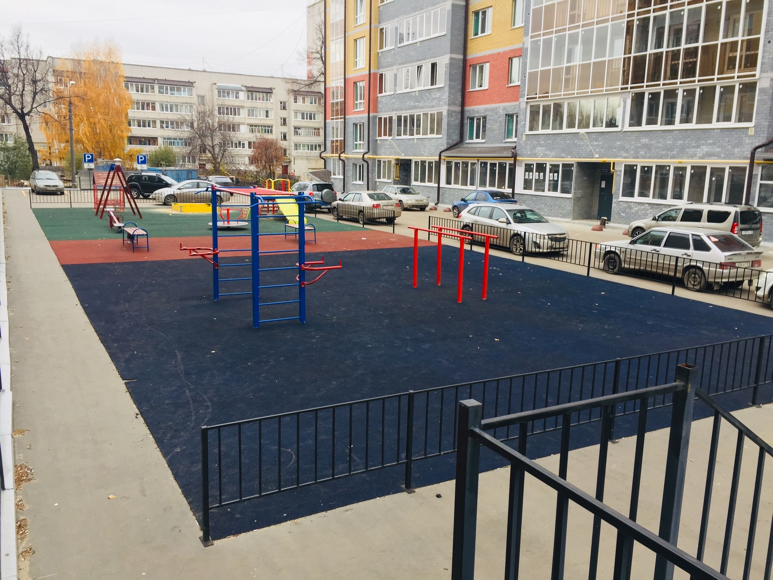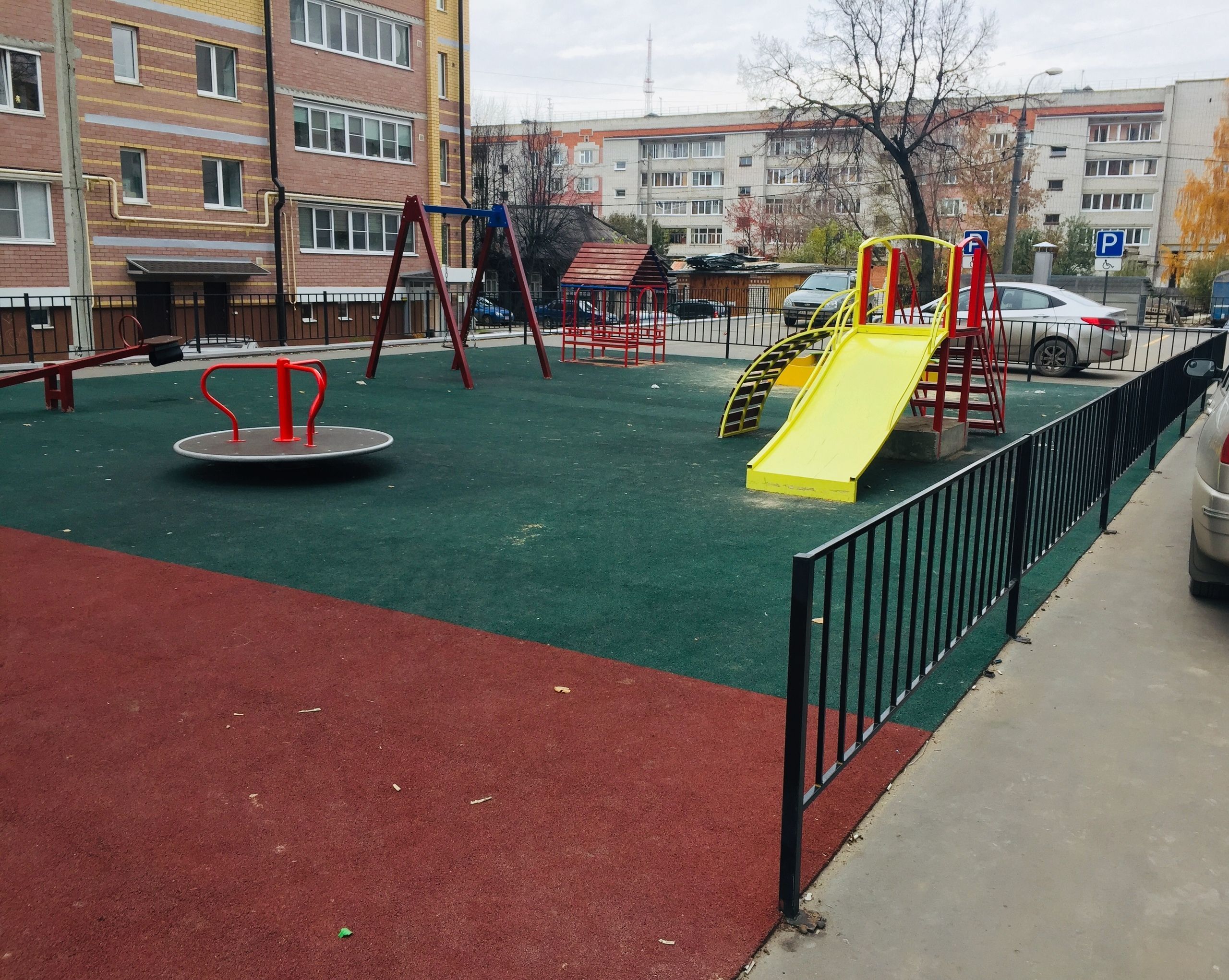 Покрытие детской и спортивной площадок, расположенных прямо на крыше подземного гаража, цветное и резиновобитумное. Заехать во двор можно с двух сторон по пандусу.