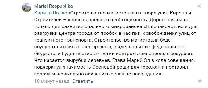 Правительство республики ответило, что строительство магистрали в створе улиц Кирова и Строителей – давно назревшая необходимость. Дорога нужна не только для развития спального микрорайона «Ширяйково», но и для разгрузки центра города от пробок в час пик, освобождения улиц от транзитного транспорта. Строительство магистрали будет осуществляться за счет федерального бюджета, и будет вестись строгий контроль финансовых ресурсов. По поводу вырубки деревьев Глава Марий Эл подчеркнул, что зелёные насаждения должны быть максимально сохранены.